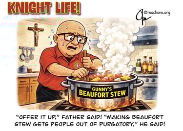 Their adventures form the heart of our Knight Life cartoon stories—short, humorous looks at the everyday work of faith, friendship, and service inside parish life and out in the community. We try very hard to make all of our cartoons “single panel.” It’s the ultimate challenge in telling short, short stories.
